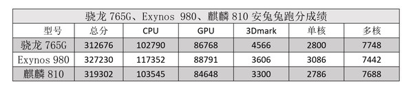 Exynos 980、麒麟810、驍龍765G安兔兔單核、多核跑分