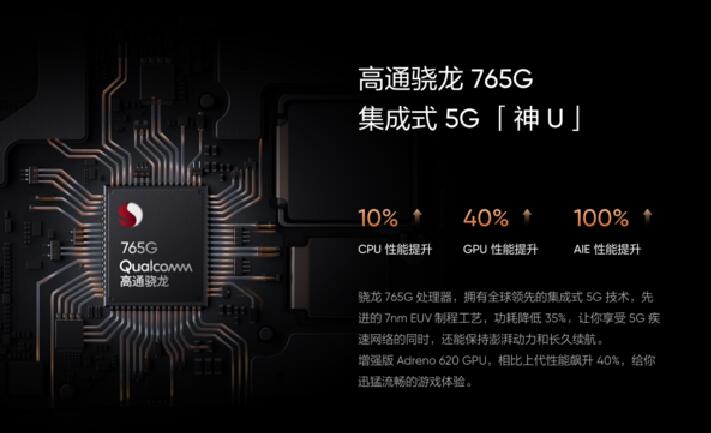 驍龍765G,這顆處理器是高通近期發布的中高端芯片,其定位稍低于麒麟810,同是采用7nm工藝制程。這款處理器使用與驍龍855相同的Kryo475架構,最高的主頻為2.4GHz,而GPU則是Adreno620。驍龍765G是一個集成式5G芯片,支持SA/NSA雙模組網,最高下載峰值為3.7Gbps。驍龍765G的CPU性能相比上代提升10%,GPU性能提升達40%,AI運算力提升高達100%。這些方面的提升,令驍龍765G的視頻、游戲運行畫面更流暢更真實。