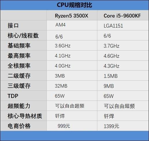 現(xiàn)在在千元價(jià)位,售價(jià)1399元的i5-9600KF比較受玩家歡迎,而AMD這邊與之對(duì)位的是銳龍5 3600。不過(guò)實(shí)際就游戲性能而言,銳龍5 3500X與3600并沒(méi)有多少差別,在參數(shù)上也與i5-9600KF更為接近,二者同樣都是6核心6線程。