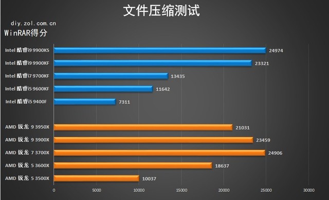 在WinRAR的測試中,趨勢與跟我們之前的多核心測試很像,英特爾酷睿i9-9900KS獲得了領先,但有意思的是三代銳龍在這款軟件中略不敵九代酷睿,這是因為WinRAR其實并沒有跑滿全部的核心測試,而且還有優化的問題再影響。