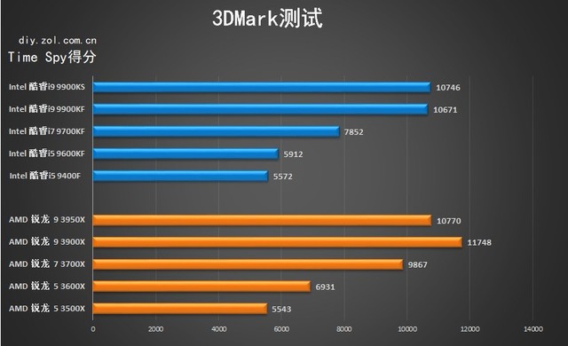 DX12環境是未來主流的圖形環境,也是DX11環境的接班人,未來的游戲都會朝著DX12環境發展,在這項測試中,九代酷睿幾個型號與三代銳龍各有勝負,不過領先的是AMD Ryzen 9 3900X,看來我們前面提到的優化和利用率在這項測試中依舊存在。
