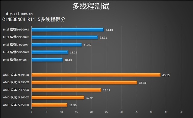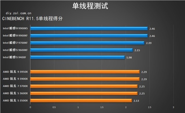CINEBENCH R11.5的單線程測試中,英特爾處理器仍有很明顯的優勢,其中英特爾酷睿i9-9900KS和英特爾酷睿i9-9900KF單核分數一樣,因為這倆都有睿頻5.0的能力,不過區別酷睿i9-9900KS是全核而i9-9900KF是單核。