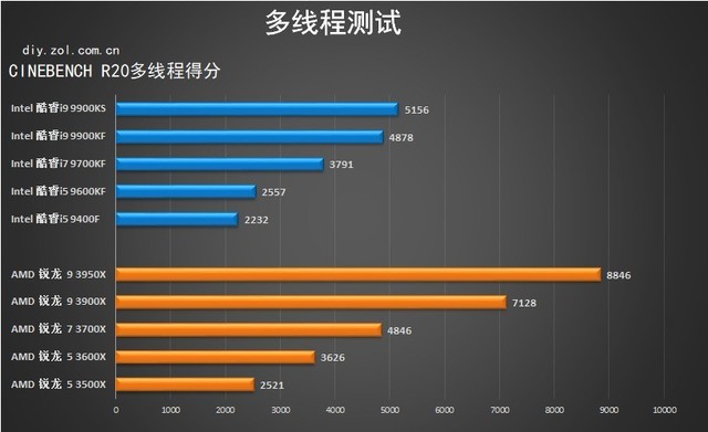 CINEBENCH R20測試與CINEBENCHR15多線程測試一樣,AMD三代銳龍處理器依舊占據了絕對優勢,這點正好跟單核心測試相反。