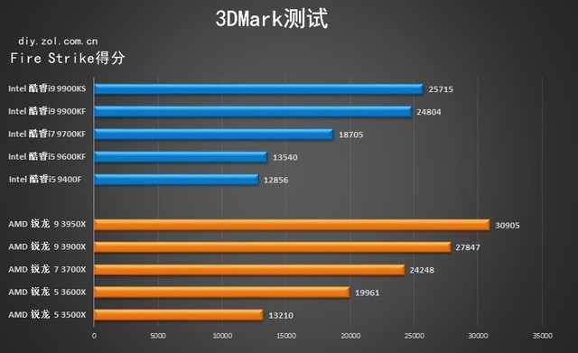 在FireStrike的測試中,核心線程數再次占據了優勢們,也就是這方面是三代銳龍處理器更吃香一些,AMD Ryzen 9 3950X占據明顯的優勢。