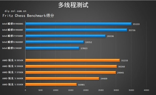 Fritz Chess Benchmark是測試CPU多核心性能的經典軟件,數值越大越好。可惜這款軟件最多支持16線程同時運算,也就是說向AMD 銳龍 9 3950X和銳龍 9 3900X這兩個32線程、24線程的處理器就比較吃虧,只能測試到16線程。