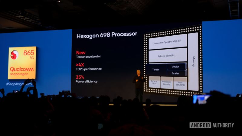 驍龍865內(nèi)置的Hexagon 698協(xié)處理器,加入了全新張量加速器、每兆次運算效能更提升4倍以上,而電力損耗則是降低35%左右。配合第5代驍龍AIE人工智能引擎,驍龍865可實現(xiàn)每秒15兆次(15 TOPS)AI運算能力,相比驍龍855每秒7兆次AI運算李,增長了2倍以上,更是驍龍845的5倍左右。