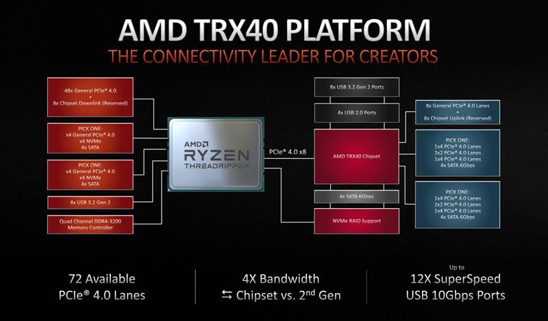 三代ThreadRipper平臺支持多達88條PCIe 4.0(二代為64條PCIe 3.0),其中處理器64條、芯片組24條,實際分別可用56條、16條,總計為72條(可配置連接NVMe、SATA硬盤),而處理器與芯片組之間的通道為PCIe 4.0 x8,帶寬達16GB/s,是上代PCIe 3.0 x4的四倍。