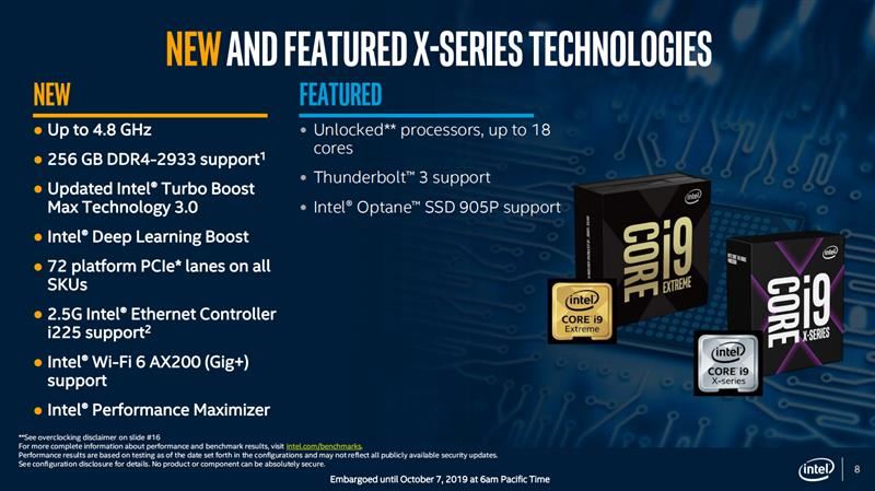 第十代酷睿X處理器采用Cascade Lake-X架構(gòu),依舊采用14nm++工藝,相對上一代產(chǎn)品,引入了更新的指令集,主頻方面也有所提高。除此之外,新處理器在內(nèi)存,PCIe,AI人工智能,網(wǎng)絡(luò)等方面,也有提升。整體性能較上一代產(chǎn)品進(jìn)一步增強(qiáng)。