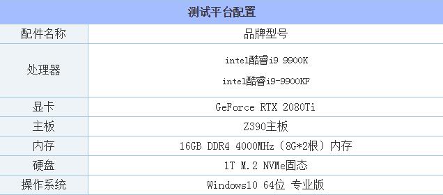 測試平臺電腦配置方面,我們分別使用了i9 9900K和i9-9900KS處理器進行測試(默認頻率),主板選用了Z390主板,其它硬件保持一致,顯卡方面我們選用了RTX2080Ti,配備雙8G DDR4 4000Mhz頻率組建的16G雙通道內存,Windows10 64位專業版系統。