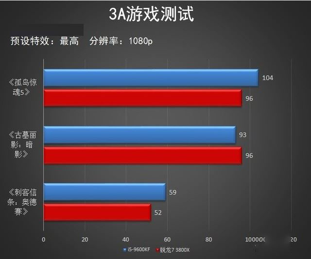在1080p的分辨率下,這兩款處理器各有勝負(fù),i5-9600KF在《孤島驚魂5》和《刺客信條:奧德賽》中占有優(yōu)勢,而AMD銳龍7 3800X則在《古墓麗影:暗影》里更勝一籌。