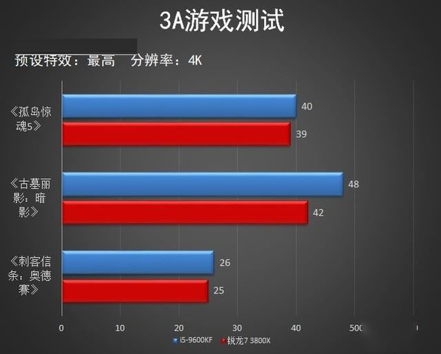 4K分辨率與2K分辨率的測試趨勢一樣,都是i5-9600KF更具優(yōu)勢,單核高頻顯然在游戲中更吃香,而且目前的游戲環(huán)境來看,6核心已經(jīng)能夠勝任各種游戲的需求,3A大作完全能滿足。