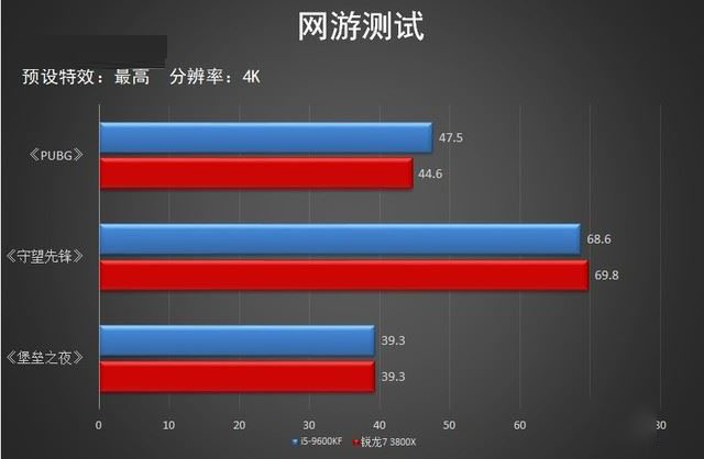 最后的4K分辨率下,《PUBG》中i5-9600KF依舊強(qiáng)勢,而AMD銳龍 7 3800X則在《守望先鋒》中扳回一城,《堡壘之夜》兩者打了平手,應(yīng)該是這個(gè)游戲的幀數(shù)限制原因,雖然已經(jīng)開了無限幀數(shù)。