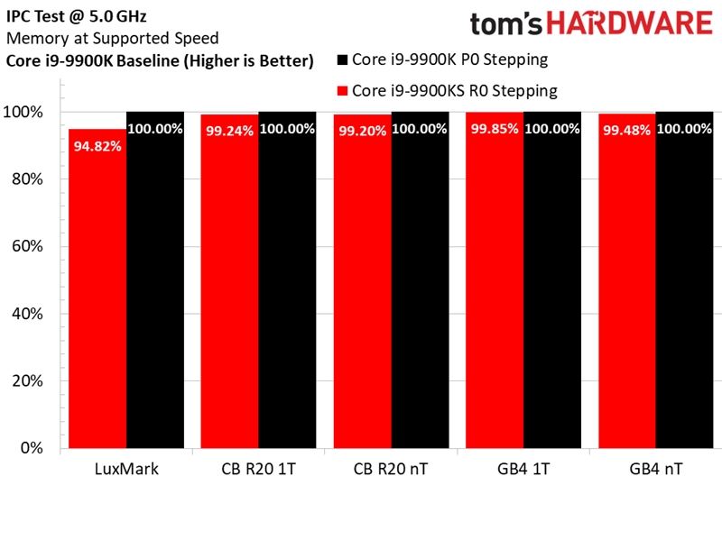 另一方面,新步進也也進一步優化挖掘了性能,i9-9900KS、i9-9900K同頻率對比實測顯示,LuxMark性能提升了多達5.5%,CineBench單線程、多線程性能都提升了最多0.8%。
