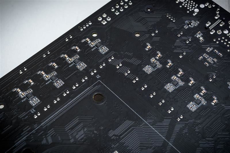 CPU供電為12+2相,供電PWM芯片為ISL生產,型號沒有看清~,根據MOS倒推比較有可能是ISL69138;CPU的核心供電由6顆DRIVER并聯,達成12相陣列;供電輸入電容為6顆尼吉康的FP12K固態電容(270微法,16V);MOS為每相1顆SIC634;輸出電感為每相1顆(感值R22);輸出電容為17顆尼吉康的FP12K固態電容(560微法,6.3V)。整體的供電方案屬于中等偏上的水平。