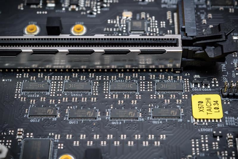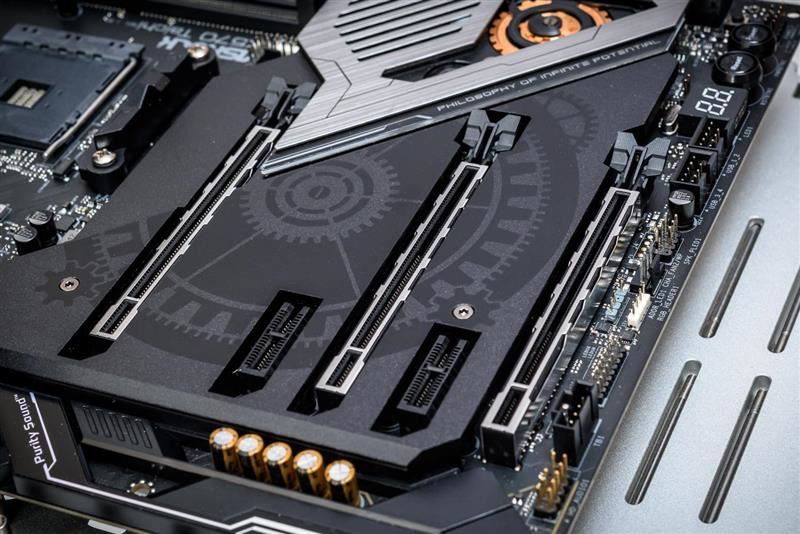 PCI-E X16旁邊可以看到4顆PI3EQX16芯片,這是用于PCI-E 4.0通道的中繼,保證PCI-E 4.0通道可以滿速運行。下面的4顆PI3DBS芯片是用于拆分PCI-E X16通道,讓兩根直聯CPU的顯卡插槽可以運行在8+8模式。