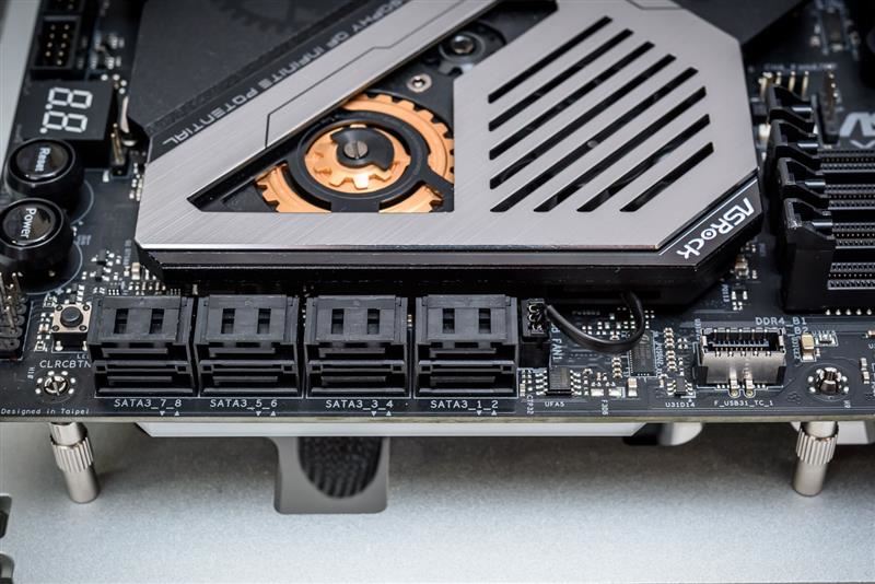 靠近芯片組這一邊,圖中左起為SATA 3.0*8、前置USB 3.1 TYPE-C。