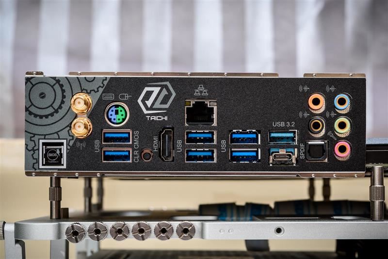 主板后窗接口也是相當豐富,從畫面左邊開始分別是,USB BIOS Flashback按鈕;無線網卡接頭;PS/2+USB 3.0*2;CLEAN COMS按鈕+HDMI;Intel 千兆網卡+USB 3.0*2;USB 3.0*2;USB 3.1 A+C;3.5音頻*5+數字光纖。