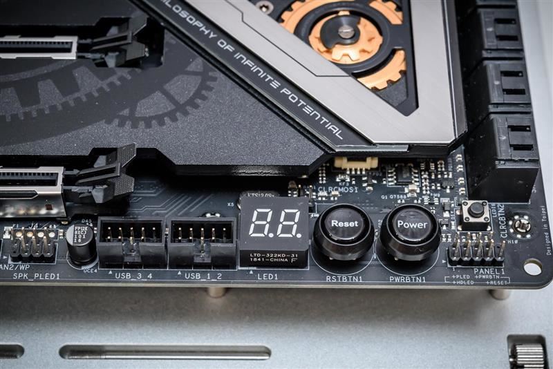 在主板的下側邊,靠芯片組一側圖中左起為電源LED和蜂鳴器、前置USB 2.0*2、80診斷燈、電源開關和重啟按鍵、機箱其余的控制針腳。