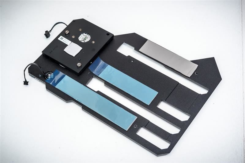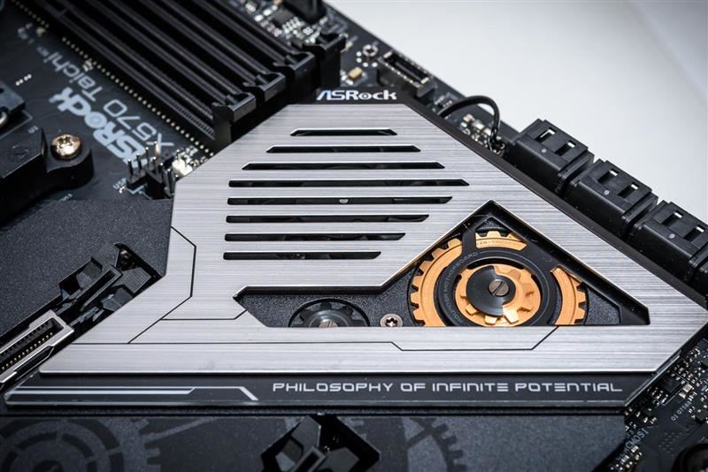 這次所有的X570主板芯片組散熱都是帶風扇的,拆開之后可以看到芯片組散熱器和上層M.2散熱片是獨立的,中間有導熱墊連接。