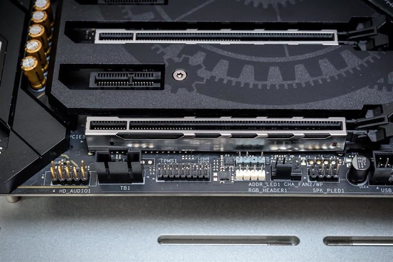 靠主板音頻部分一側,圖中左起分別為前置音頻、雷電子卡擴展口、TPM、RGB+數字 LED插座、SYS FAN。