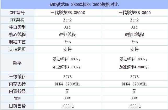 老規(guī)矩,我們先來看下Ryzen5 3500X和3600基本參數(shù)對比情況,初步來了解一下這兩款CPU之間的性能差距。