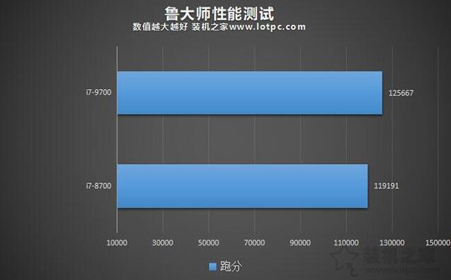 魯大師跑分測試結果,i7-9700跑了125667分,而i7-8700則跑了119191分,i7-9700領先,但性能差距不大。