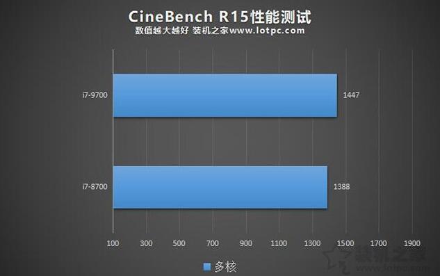 在CINEBENCH R15基準測試中,i7-9700在多線程基準性能測試得分為1447分,而i7-8700在多線程基準性能測試得分為1388分,i7-9700K領先了4%左右。