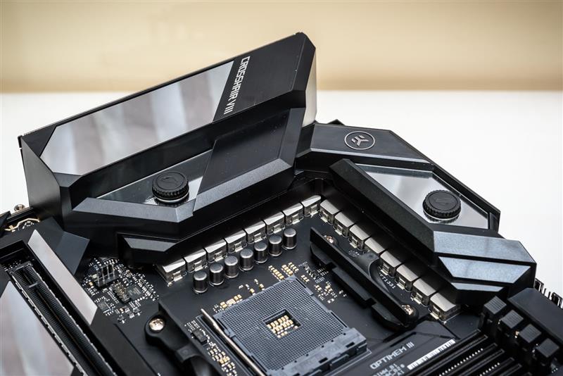 CPU供電的散熱部分為一個水冷頭,不上水的時候也可以作為正常的散熱片。