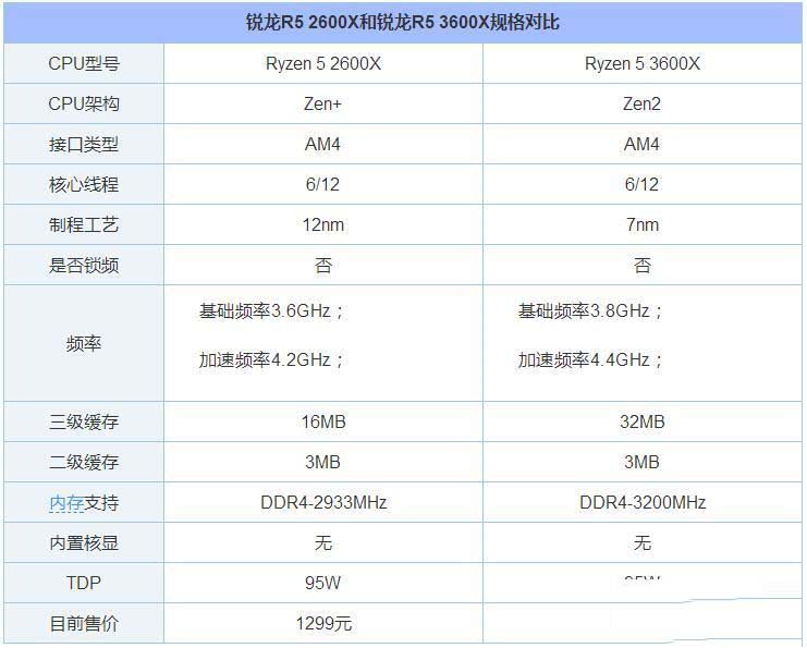 老規矩,我們先來了解一下R5 2600X和R5 3600X對比基本規格參數情況,初步了解一下這兩款CPU之間的差異。