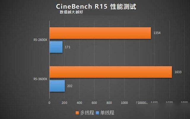 CINEBENCH R15這款專業測試軟件,其考驗的是CPU的渲染能力,新一代銳龍R5-3600X在單線程分數在202,而多線程分數在1633,而上一代銳龍R5-2600X單線程分數在171,多線程分數在1354,R5-3600X在單線程和多線程分別領先了15%、17%。
