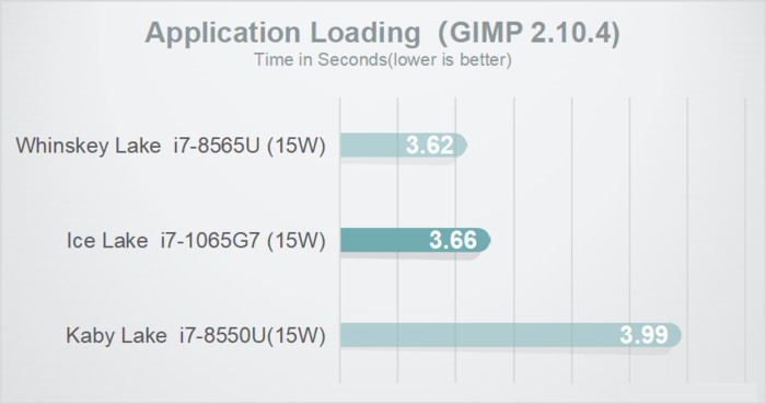在Application Loading(GIMP 2.10.4)的測試中,10代酷睿的應用載入速度比i7-8565U還要稍稍慢上一些。
