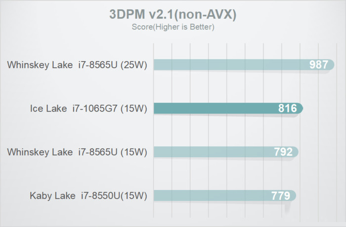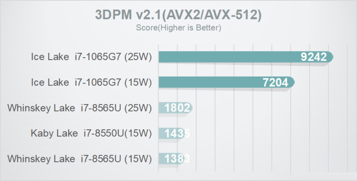 十代酷睿在非AVX測試略微領先,而憑借最新支持的AVX-512,15W模式下是8565U的多達5.2倍,25W模式下對比也有5.1倍的優勢。