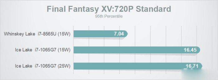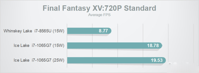 720p標準畫質下的《最終幻想15》,15W模式下游戲幀數翻了一番還多,但由于這是個CPU敏感型的游戲,開放到25W也沒啥額外好處,且此時幀率沒有達到20FPS。