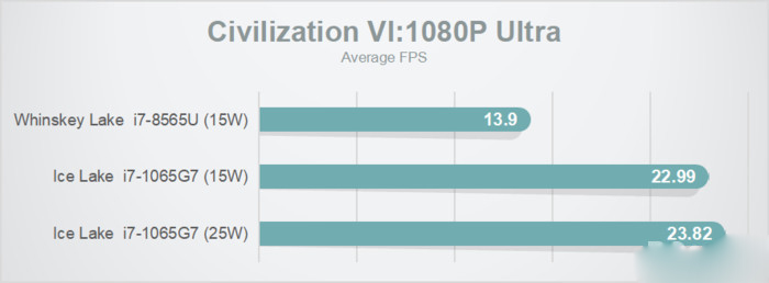 1080p高畫質下的《文明6》,15W模式下游戲幀數提升了超過70%,不過開放到25W反而有所降低。