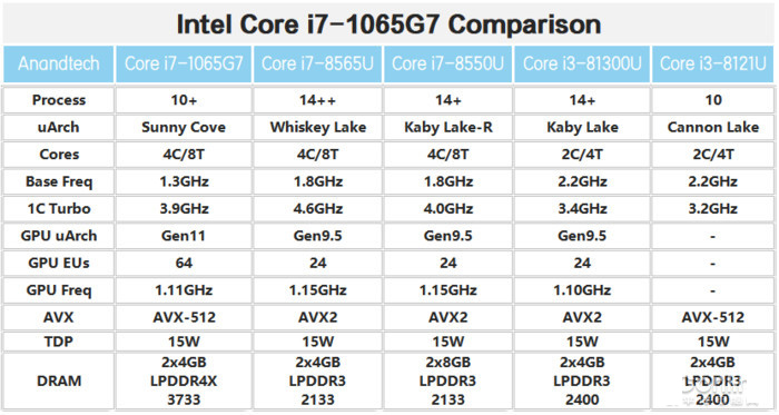 此次10代酷睿最高睿頻僅有4.1GHz與i7-8565U低了700MHz,在硬件參數層面來看還是較為吃虧的,好在其內存從LPDDR3-2133提升到了LPDDR4X-3733(U系列),這樣才在一定程度上彌補了睿頻較低的缺陷。