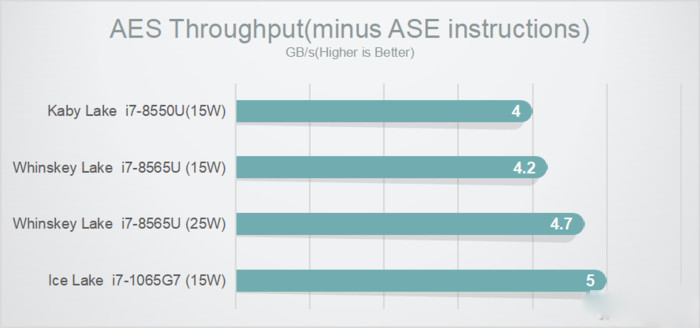 在AES Throughput(minus ASE instructions)的加解密測試中,10代酷睿表現出色,提升效率約有20%