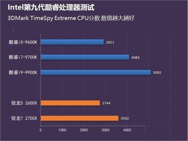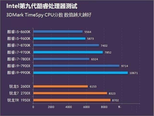 在3DMark TimeSpy Extreme測試中,i9-9900K以5092分的高分力壓群雄,在3DMark TimeSpy測試中,i9-9900K以10671的分?jǐn)?shù)拔得頭籌,也可以看出這款CPU的霸氣之處。