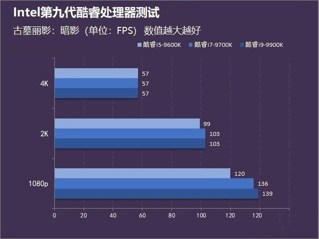 我們搭配RTX 2080Ti 顯卡再進行游戲測試,在《古墓麗影:暗影》之中,9900K在1080P極高畫質(zhì)下可以達到139的幀數(shù),即使是2K也能跑到103FPS,可以說是非常強的游戲平臺處理器,完全可以發(fā)揮出2080Ti的實力。