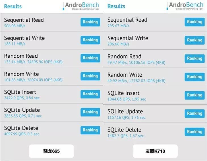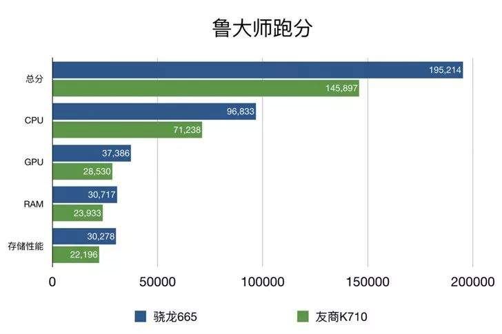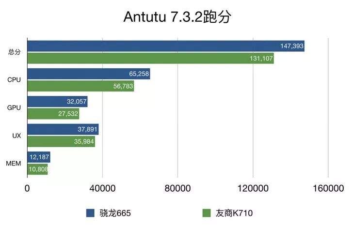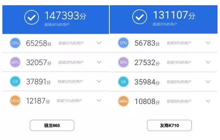 了解完CPU、GPU以及AI等單項(xiàng)能力后,可通過(guò)目前主流的跑分軟件比較下驍龍665和K710的整體實(shí)力表現(xiàn)。驍龍665安兔兔得分147393,K710平臺(tái)131107。
