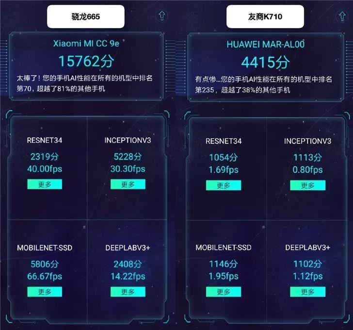 在AImark測(cè)試中,搭載驍龍665的小米CC9e得分15762分,友商K710得分4415分,兩者差距明顯。而且無(wú)論RESNET34、INCEPTIONV3還是DEEPLABV3+等所有子項(xiàng),驍龍665都較強(qiáng)。