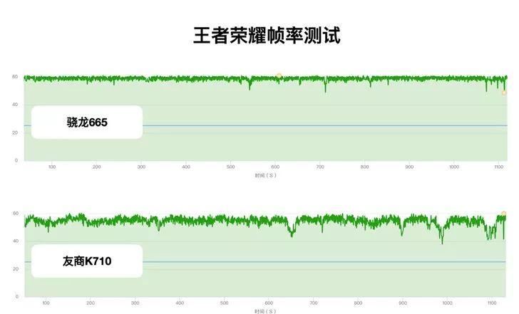 而相同畫(huà)面設(shè)置下,同樣視角運(yùn)行同一局游戲,采用K710芯片的手機(jī)平均幀率54.3fps。