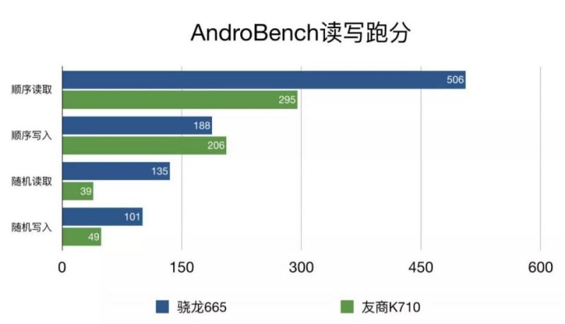 小米CC9e搭載了LPDDR4x內(nèi)存和UFS 2.1閃存,其數(shù)據(jù)讀寫(xiě)能力更優(yōu)秀。在Androbench測(cè)試中,單通道UFS 2.1的小米CC9e順序讀取506MB/s,隨機(jī)讀寫(xiě)破百,比起K710手機(jī)內(nèi)置的eMMC閃存優(yōu)勢(shì)明顯,在游戲解壓、加載速度上會(huì)有更加優(yōu)秀的體驗(yàn)。