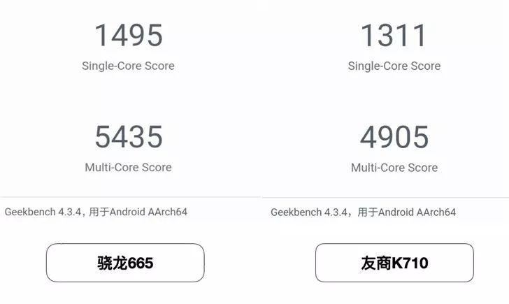 在GeekBench 4測(cè)試中,驍龍665和友商K710平臺(tái)相比,單核以及多核得分都略勝一籌。