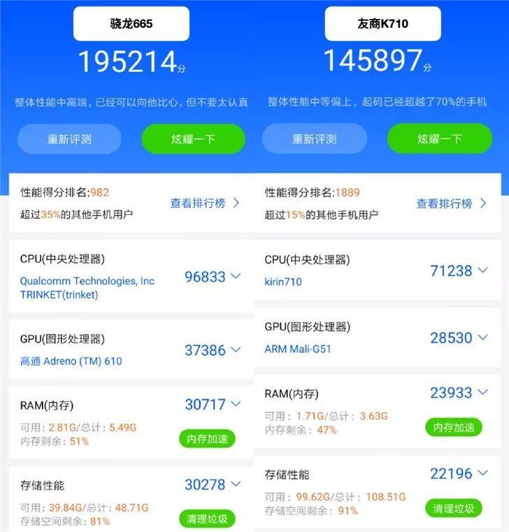 而在另一款跑分軟件中,搭載高通665的小米CC9e得分195214,遠(yuǎn)高于K710平臺(tái)的145897分,同樣高于驍龍660的165683分。