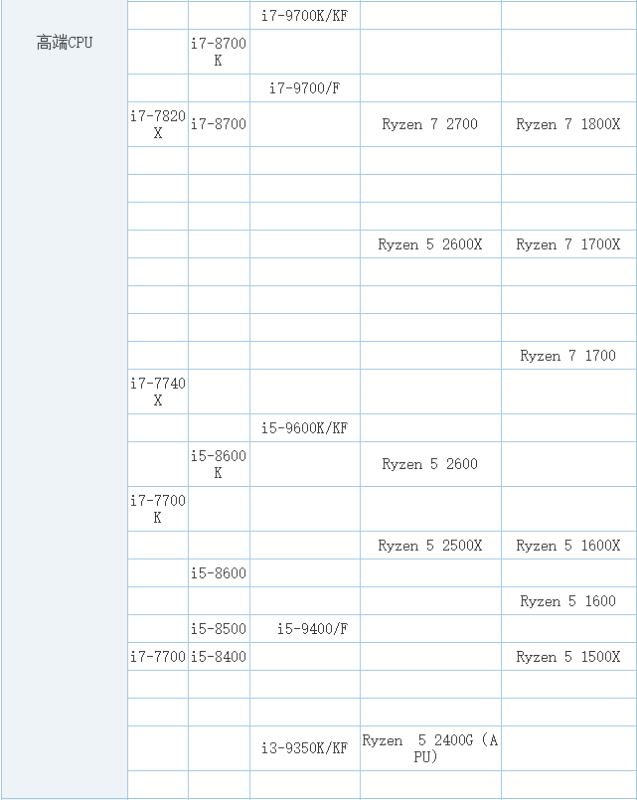 高端:Intel酷睿i7 8700/8700K/9700/9700K/8086K/i9-9900K、AMD銳龍7 2700/2700X;