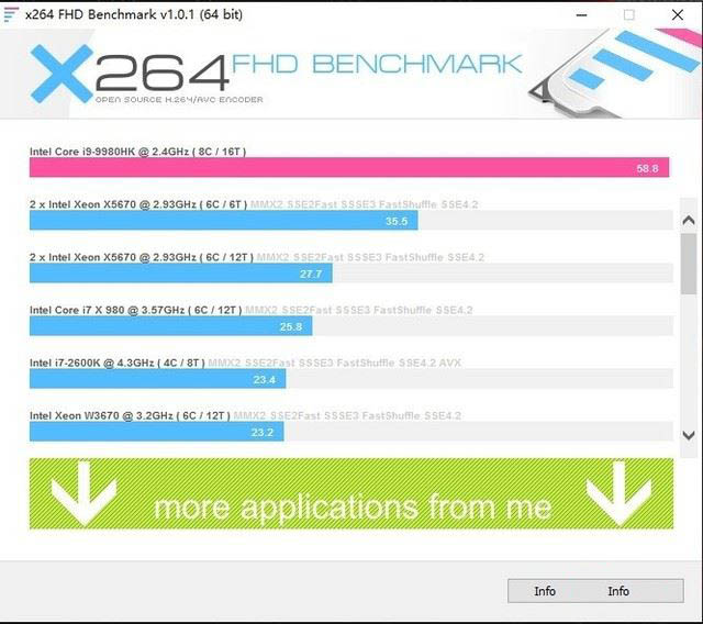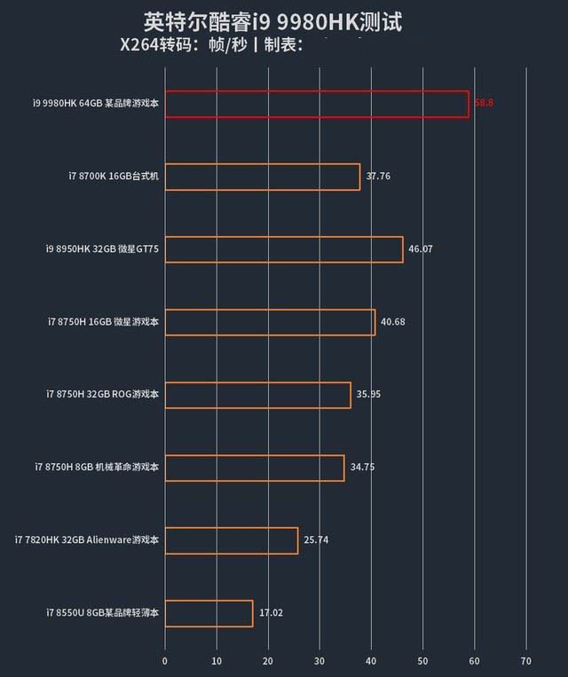 通過測(cè)試可見,酷睿i9 9980HK能夠達(dá)到58.8幀/秒的速度,而上一代酷睿i9 8950HK為46.07幀/秒,上一代桌面級(jí)酷睿i7 8700K為37.76幀/秒,因此酷睿i9 9980HK擁有移動(dòng)級(jí)處理器中目前最高效的視頻轉(zhuǎn)碼效率。