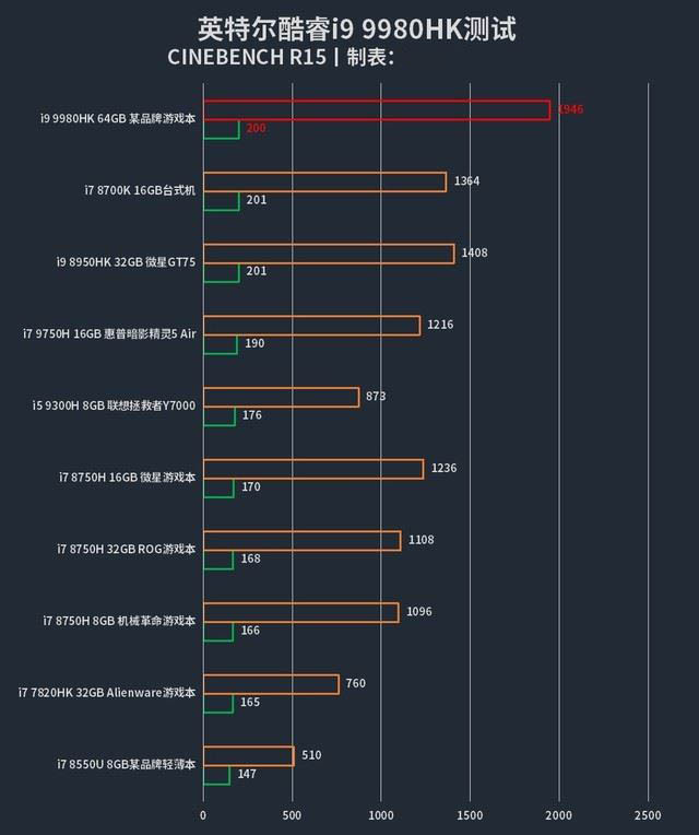 CINEBENCH R15是一直以來(lái)沿用下來(lái)的單核和多核測(cè)試軟件,所以整體的分?jǐn)?shù)收集更加全面,我挑選了一些較具代表性的處理器進(jìn)行了對(duì)比,可以看到酷睿i9 9980HK相對(duì)于上一代高端桌面級(jí)處理器酷睿i7 8700K來(lái)說(shuō),在多核性能方面也已經(jīng)明顯超越,其多核成績(jī)達(dá)到了1946cb,基本已經(jīng)與英特爾第九代酷睿i9 9900K多核性能持平(酷睿i9 9900K多核跑分:2040cb),性能非常強(qiáng)勁。并且已經(jīng)超越酷睿i7 9700K處理器的多核跑分(1502cb)。