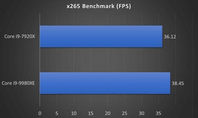 而x265 Benchmark中,酷睿i9-9980XE平均幀數為38.45FPS。