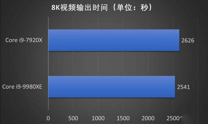 因此,就算無法全負荷運作,酷睿i9-9980XE仍然能以42分21秒成績完成一部時長為1分18秒的8K視頻輸出,酷睿i9-7920X為43分42秒左右,兩則相差不多。