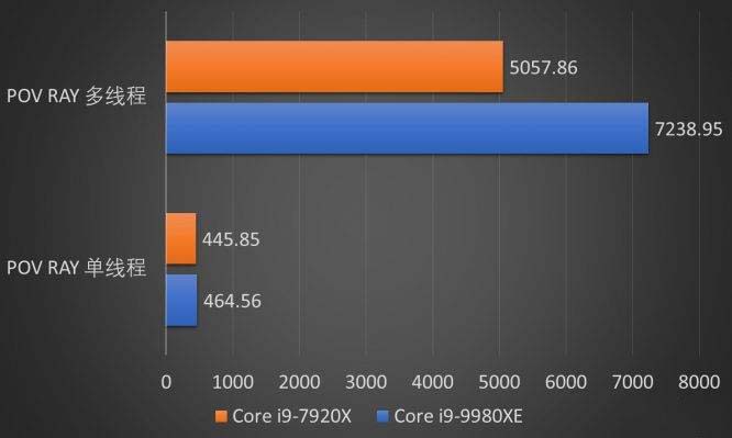 在渲染性能測試中,我們分別測試了CINEBENCH R15、Blender、POV-RAY作為參考。可以明顯看出,只要酷睿i9-9980XE的18C36T火力全開,表現相當迅猛,同時這也是創作者們最期望看到的。